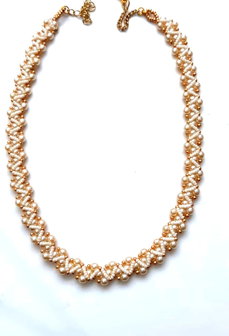 תכשיטי הפנינים עשויים מפנינים מלאכותיות וחרוזי פנינה צ'כיות, הנעשים בעבודת חריזה.